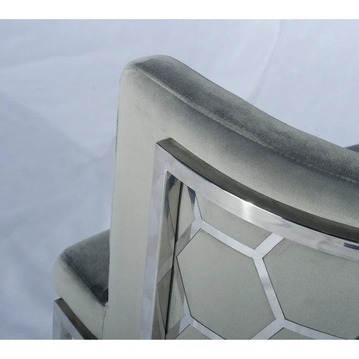 You want a dining chair that looks refined and feels supportive. The Rose velvet modern stainless steel dining chair grey silver suits Sydney dining rooms, kitchens, and formal spaces. The soft grey velvet creates a calm, modern look. The silver stainless steel frame with geometric side detail adds structure and visual interest.